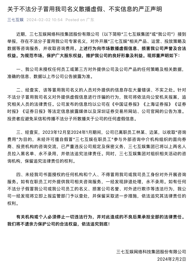 2月2日,三七互娱发布声明称,近期公司接到举报,存在不法分子冒用公司专家名义,对外开展“三七互娱”相关产品、运营、投放策略及数据等咨询服务,并收取咨询费用。三七互娱表示,公司未授权任何员工或第三方对外提供公司及公司产品的任何策略及相关数据。经查实,2023年12月至2024年1月期间,公司已离职员工林某、边某,以收取“咨询费用”为目的,未经许可擅自假冒“三七互娱在职员工”参与外部咨询中介机构组织的面向券商、投资机构的咨询交流,已严重违反公司规定及保密义务,三七互娱集团已将以上两名人员拉入黑名单、永不录用,并依法追究法律责任。