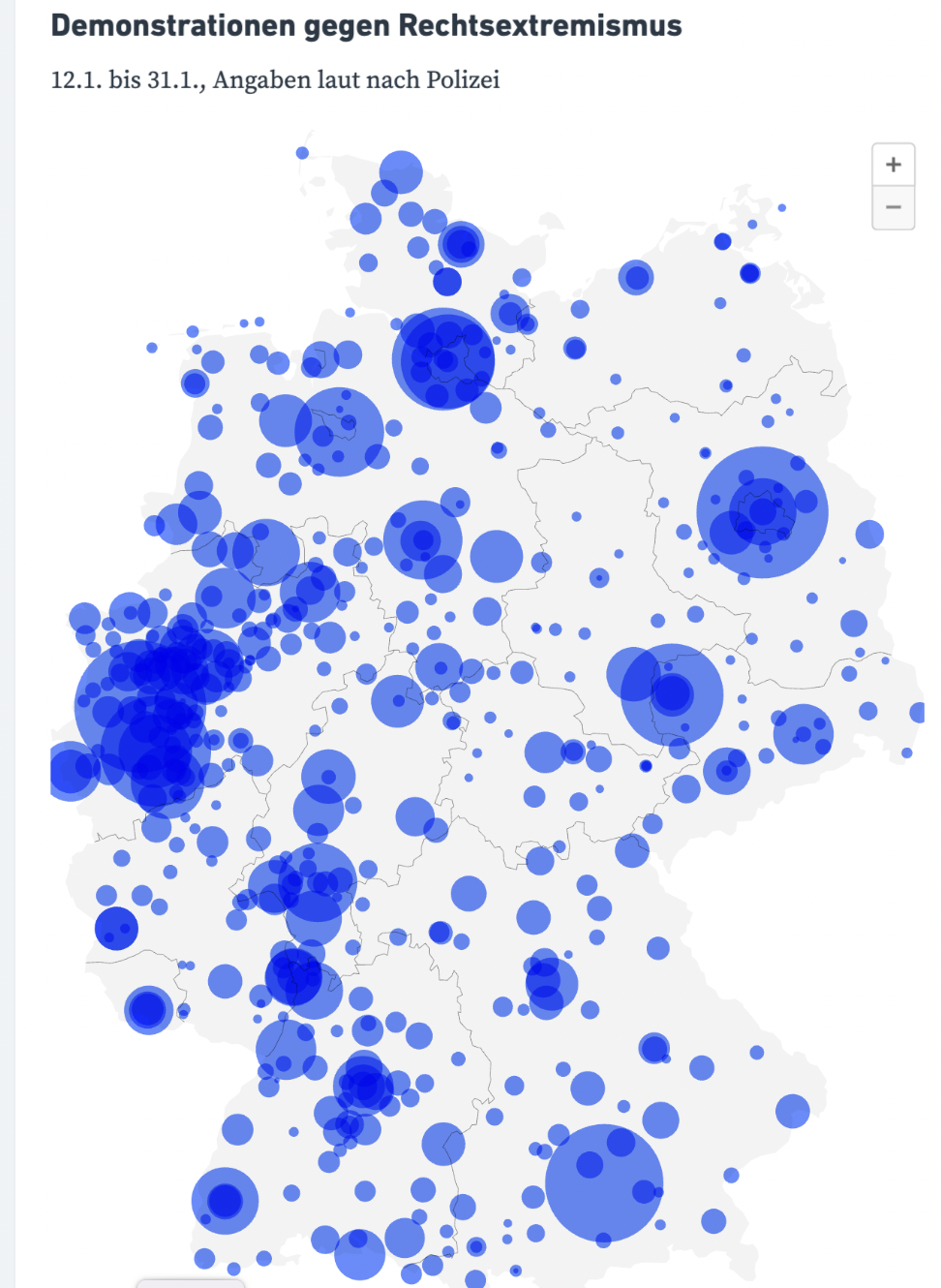 半个多月以来,已经有数百万人走上德国街头,表达对右翼极端主义的反对。据德国内政部数据,仅在上周末,就有约90万人参加。截至发稿,在社交媒体的抗议组织群组中,仍不断有人发布和询问自己所在城市抗议活动的时间和地点,群组管理员更是呼吁要将抗议持续到今年年底。