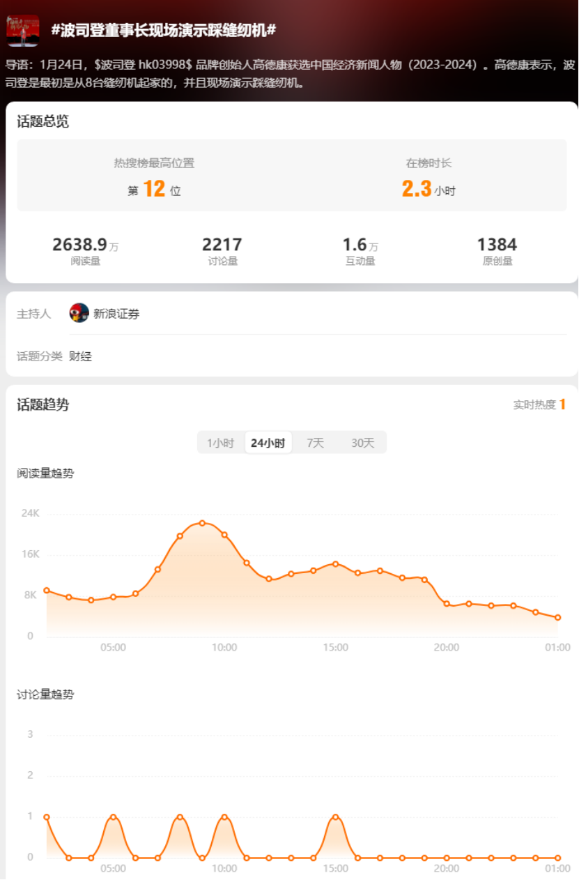 从二姐自身角度来看,前几天看到踩缝纫机的话题就点进去了,然后看到是波司登老板在一个什么会上展示自己不忘初心奋斗史之类的,然后几秒就关闭网页退出了。很快,自己对波司登到底举办什么活动还是参加什么活动已经没什么印象了。如果不是晚些时候又在榜单上看到这个话题想讨论一下这个现象,或许也不会再次点击和检索。