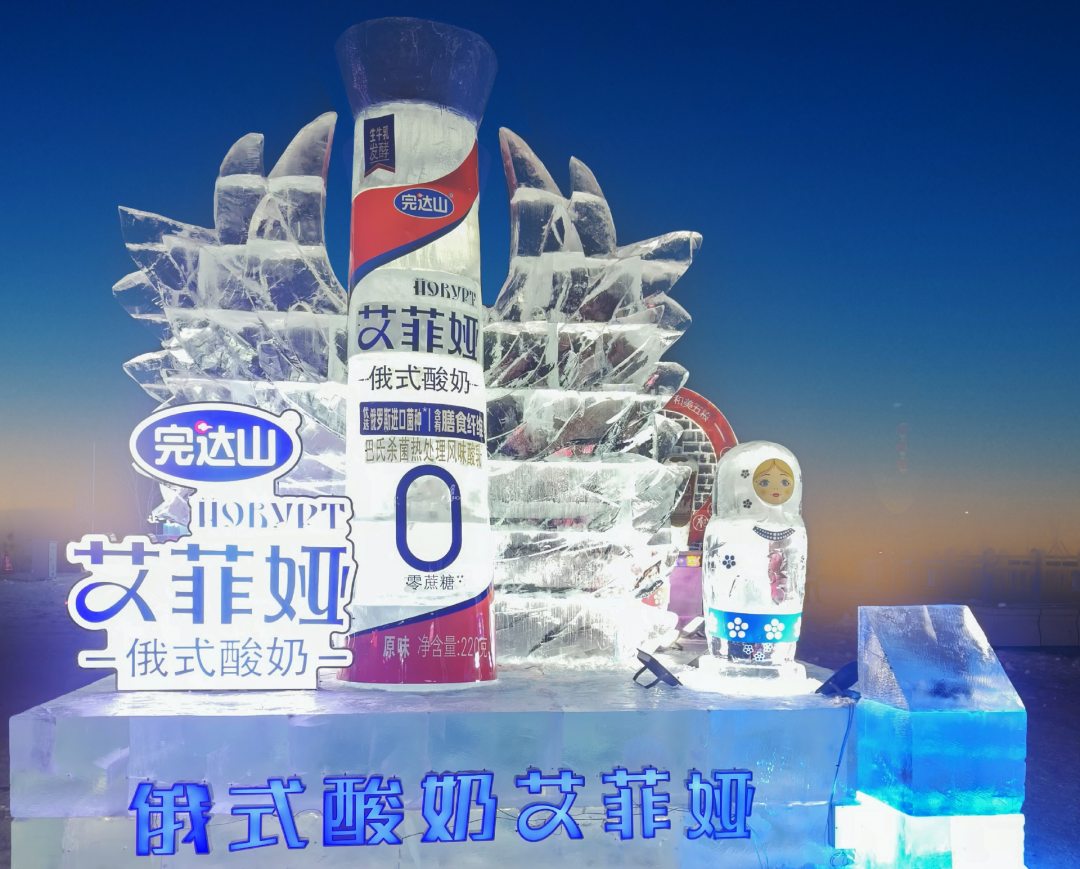 当南方小土豆们来到这个魅力十足的冰雪之城时,映入眼帘的是完达山主题冰雕、中央大街的乳此新鲜旗舰店、充满异域风情的“艾菲娅”俄式酸奶、免费的产品品鉴以及温热牛奶提供......在“霸总型”东道主人设之下,完达山乳业成功破圈,“高寒生态冰雪好奶”的形象更加深入人心。