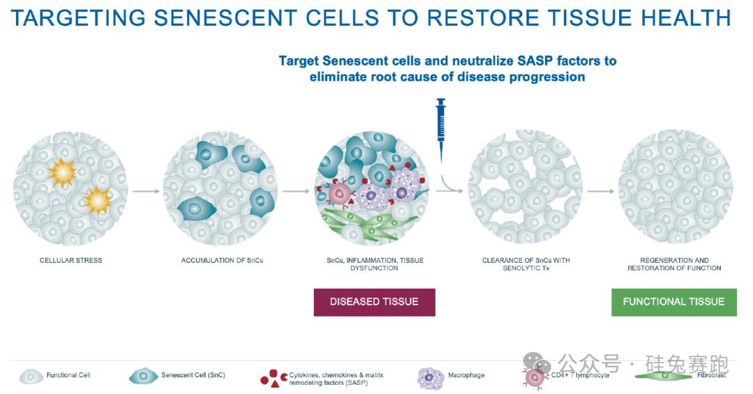 已有实验证明,通过将老鼠的衰老细胞杀死,它们的寿命能延长三分之一,同时肾脏和心脏功能都能得到改善,Unity以此原理来改善骨关节炎和衰老性失明相关疾病,其研发的UBX1325在临床试验中已经展现出长达18周改善患者视力和视网膜的效果。Unity Biotechnology在2018年于纳斯达克上市。