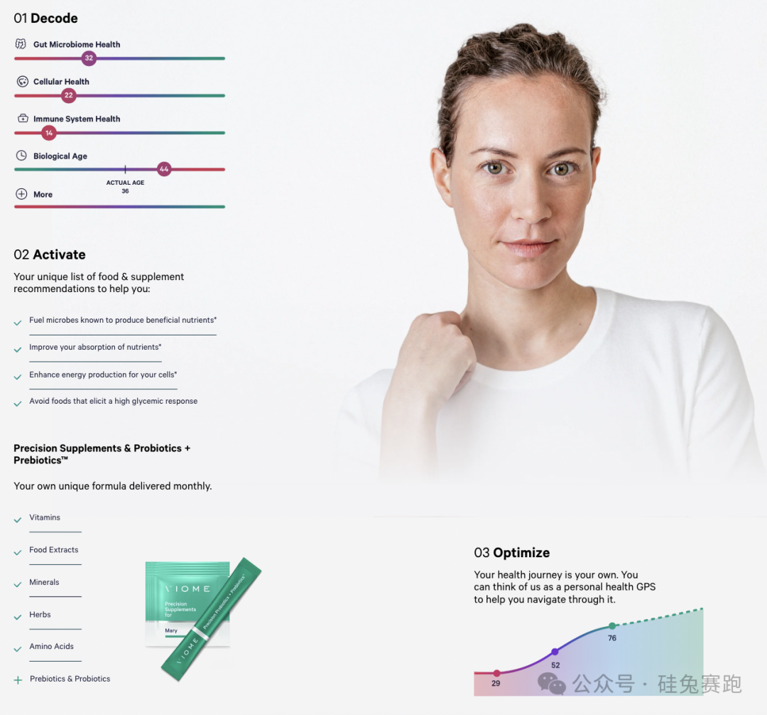 这几年来大火的肠道健康研究还将人类的衰老和肠道菌群密切相连,VIOME这家基于RNA测试的微生物组科技公司为用户提供针对全身健康的个性化食物和营养建议,根据每个人的生物特征来推荐补剂、益生菌和益生元的精确剂量,其定制化精准营养方案已表明可将肠易激综合症的疾病严重程度降低 36% ,并将2型糖尿病的风险降低30%。