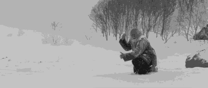 王德顺第一个出场镜头里类似「寒江钓雪」意味的构图,已经表明了这部电影将演员表演落实在整体观念下的导演思维中的意图,他一个人孤独地坐在画面右上方,人影四围飘雪茫茫,只有他是黑色的,黑白对比如此分明,导演的自我意识呼之欲出,这样的大块面背景构图在影片中所在多见。
