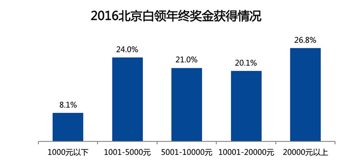 智联招聘此次调查显示,参与调查的北京白领中有38.6%表示能够拿到年终奖,12.4%的白领表示企业承诺年后发放。在到手的年终奖励中,8.1%的白领年终奖不到1000元,24%的白领年终奖在1001-5000元之间,此外年终奖5001-10000元以及10001-20000元之间的白领比例分别为21%和20.1%,比例最高的为20000元以上,为26.8%。