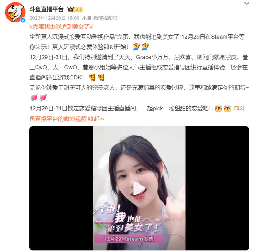 在更早的12月29日,还有斗鱼美女主播参与制作的《完蛋!我也能追到美女了!》。