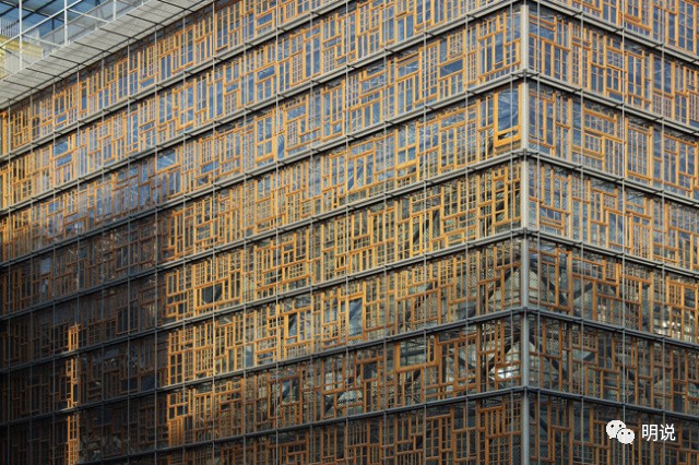 大楼的外立面全部用的是玻璃,在建筑主体东北角的地方,除了透明的玻璃围绕外,还有 3750 块从欧洲各地回收而来的木制窗框,两者混搭出独特的视觉效果,并具体建构出「再利用」的环保美学,以及传达了欧洲文化的丰富多样性。