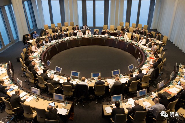 委员会大厅可以说是整坐建筑最重要的房间,位于第41层,三面窗户,风景美不胜收。欧洲各国中央银行的行长们不久将在这里开会, 并就利率问题做出决议。房间天花板镶嵌着一幅欧洲地图。委员会大厅正下方在南楼有三层是欧洲中央银行执行董事会的办公地点,其中一层全都属于欧洲中央银行行长。