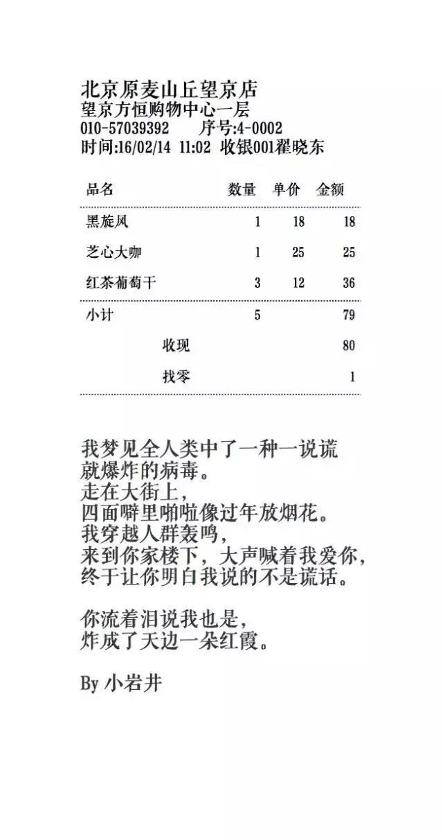 情人节的时候,我们在小票上印上了爱的故事。任何买面包的人都会在门店得到这样一张长长的小票,故事都是随机的。