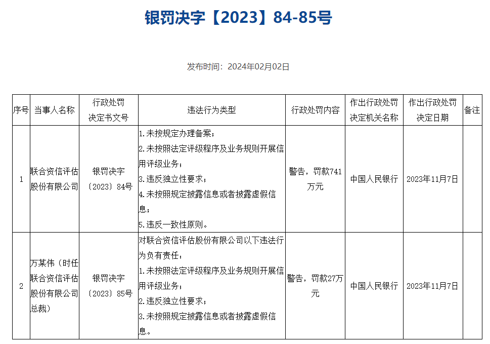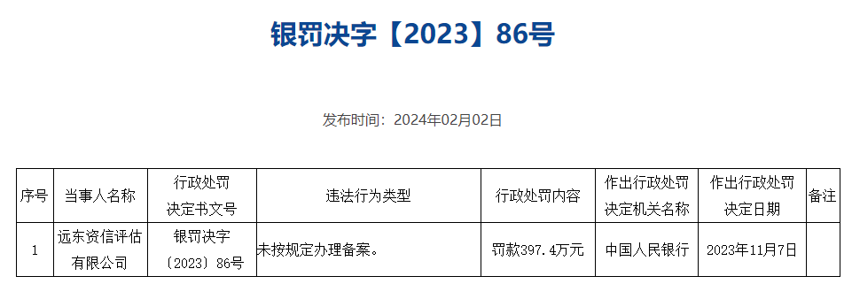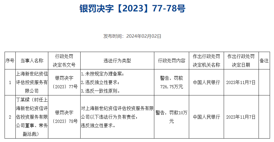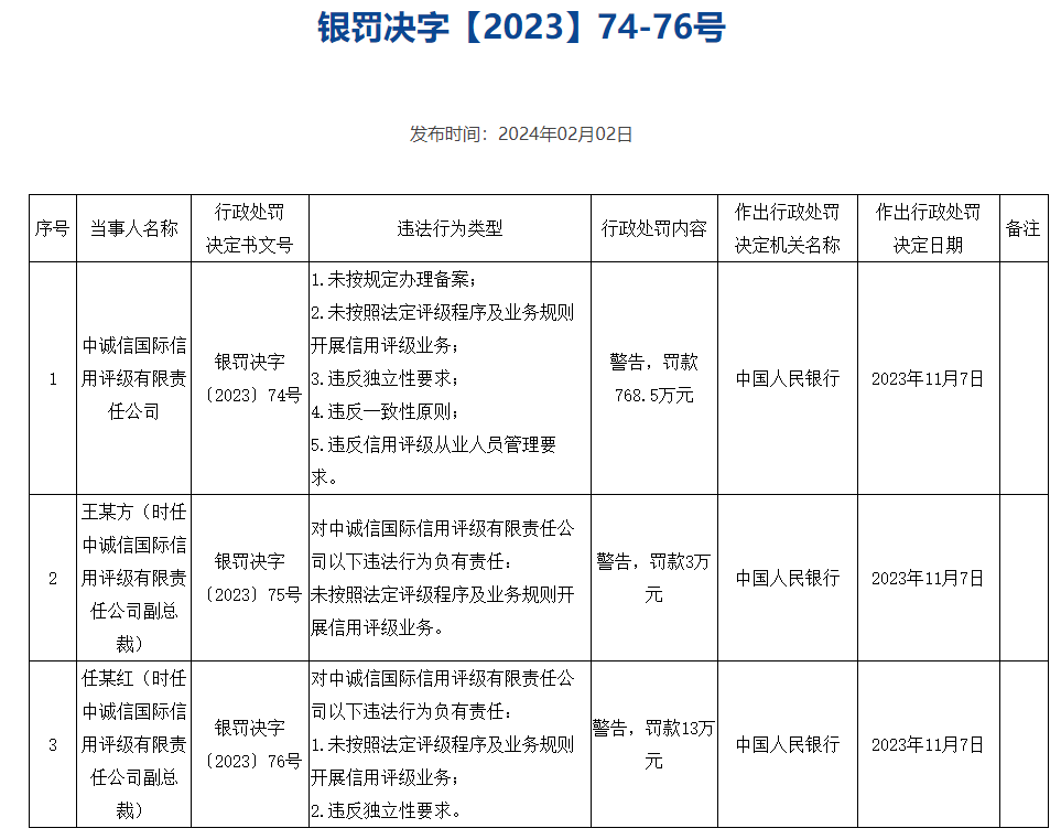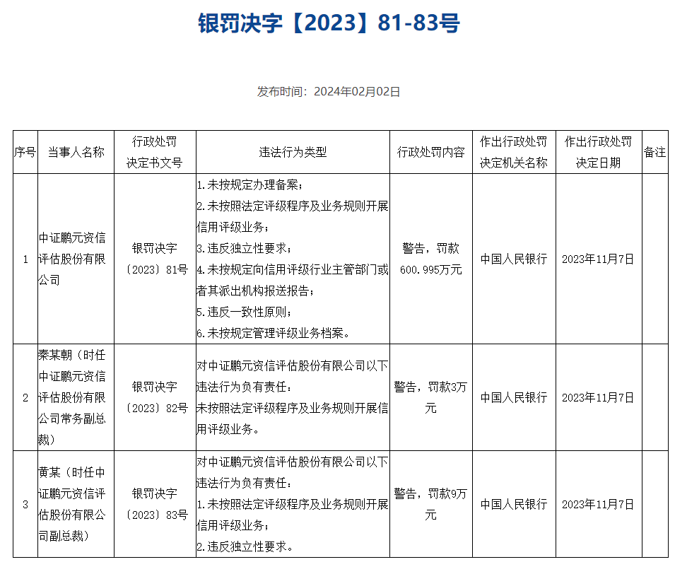 中国人民银行2月2日公示6份对评级机构的行政处罚决定,合计罚款3446.645万元。其中,标普信用评级(中国)有限公司因未按照法定评级程序及业务规则开展信用评级业务等,被处以警告和罚款212万元;中诚信国际信用评级有限责任公司因未按照法定评级程序及业务规则开展信用评级业务等,被处以警告并罚款768.5万元;上海新世纪资信评估投资服务有限公司因未按规定办理备案等,被处以警告并罚款726.75万元;中证鹏元资信评估股份有限公司因未按照法定评级程序及业务规则开展信用评级业务等,被处以警告并罚款600.995万元;联合资信评估股份有限公司因未按照法定评级程序及业务规则开展信用评级业务等,被处以警告并罚款741万元;远东资信评估有限公司因未按规定办理备案,被罚款397.4万元。上述作出行政处罚决定的日期均为2023年11月7日。