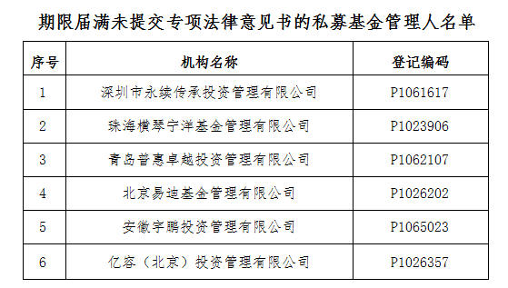 中国证券投资基金业协会2月2日发布公告称,深圳市永续传承投资管理有限公司等6家私募基金管理人存在异常经营情形,且未能在书面通知发出后的3个月内提交符合规定的专项法律意见书。协会将注销该6家机构的私募基金管理人登记,并将上述情形录入证券期货市场诚信档案数据库。已注销的私募基金管理人和相关当事人,应当根据法律法规、证监会规定以及协会相关自律规则、基金合同约定,妥善处置在管基金财产,依法保障投资者的合法利益。
