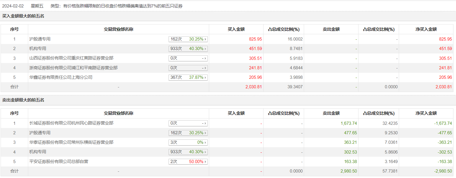 华达科技2月2日跌停,全天换手率达0.63%,振幅达11.02%。龙虎榜数据显示,营业部席位合计净卖出949.69万元。其中,机构买入451.59万元,卖出302.53万元,合计净买入149.06万元。此外,长城证券杭州民心路证券营业部、沪股通专用分别卖出1673.74万元、477.65万元;沪股通专用、山西证券重庆红黄路证券营业部分别买入825.95万元、305.51万元。