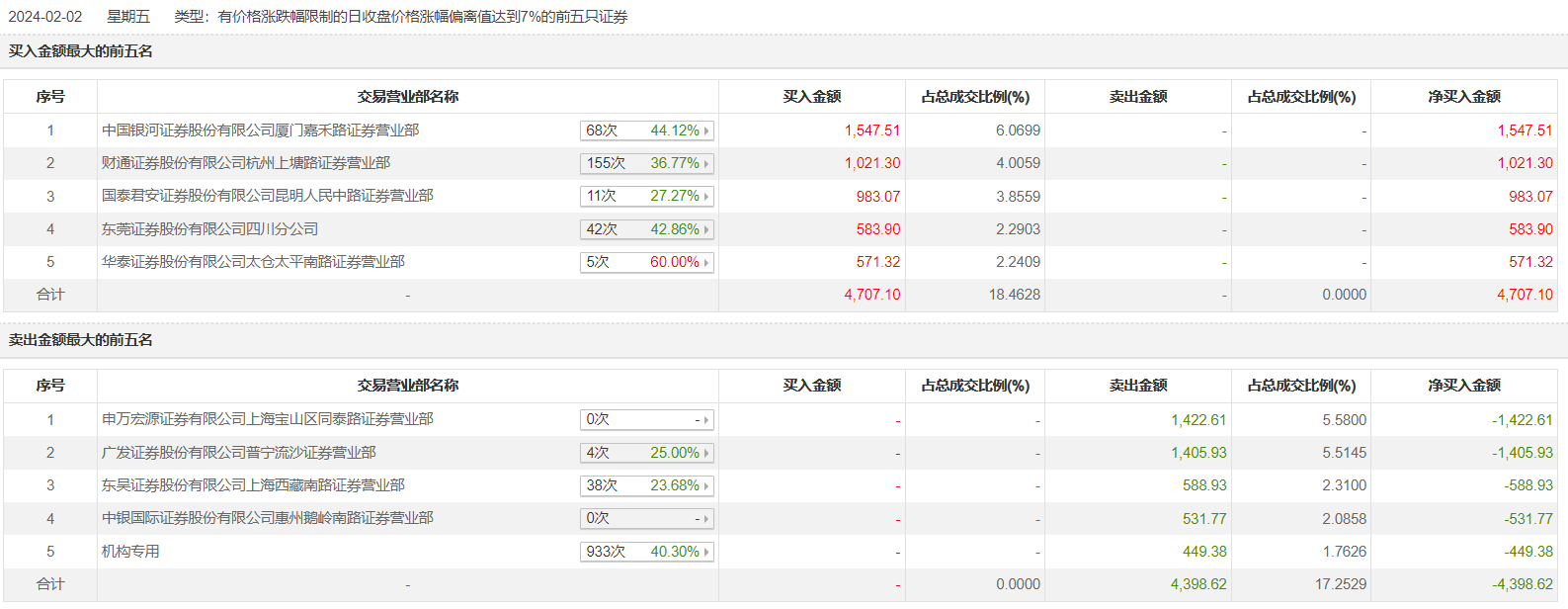 克来机电2月2日涨停,全天换手率达6.79%,振幅达3.37%。龙虎榜数据显示,营业部席位合计净买入308.48万元。其中,机构合计净卖出449.38万元。此外,中国银河证券厦门嘉禾路证券营业部、财通证券杭州上塘路证券营业部分别买入1547.51万元、1021.30万元;申万宏源证券有限公司上海宝山区同泰路证券营业部、广发证券普宁流沙证券营业部分别卖出1422.61万元、1405.93万元。