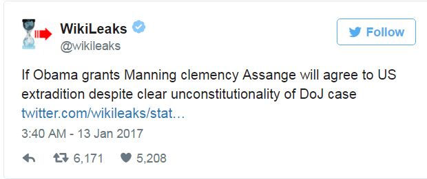 此前,维基解密在Twitter上称,如果奥巴马能对曼宁宽大处理,阿桑奇将同意被引渡到美国。从2012年起,阿桑奇一直藏身于伦敦的厄瓜多尔大使馆。