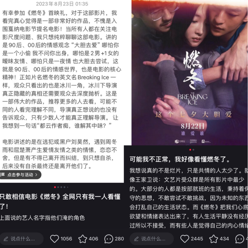另外,电影宣发也没有在第一时间根据舆情反馈调整策略。比如《燃冬》明显在小红书的口碑好于抖音,但在小红书上,《燃冬》并未学习《宇宙探索编辑部》开通主创账号,也没有太多投放,导致自然发酵的正面评价都无法转化成票房和后续的口碑助力。