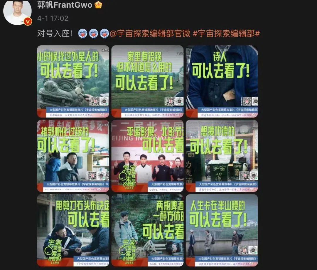 《宇宙探索编辑部》选在愚人节上映,没有头部演员加持,也不走“下沉”路线,始终贯穿“民科”主题,通过集中的预告片和物料输出,将影片中的“软科幻”和“荒诞浪漫”的元素以及伪纪录片的形式传达给观众。郭帆发布宣传微博,也是在为这部电影找到精准人群,有人因为一句“人生卡在半山腰的,可以去看了”,产生了观影兴趣。