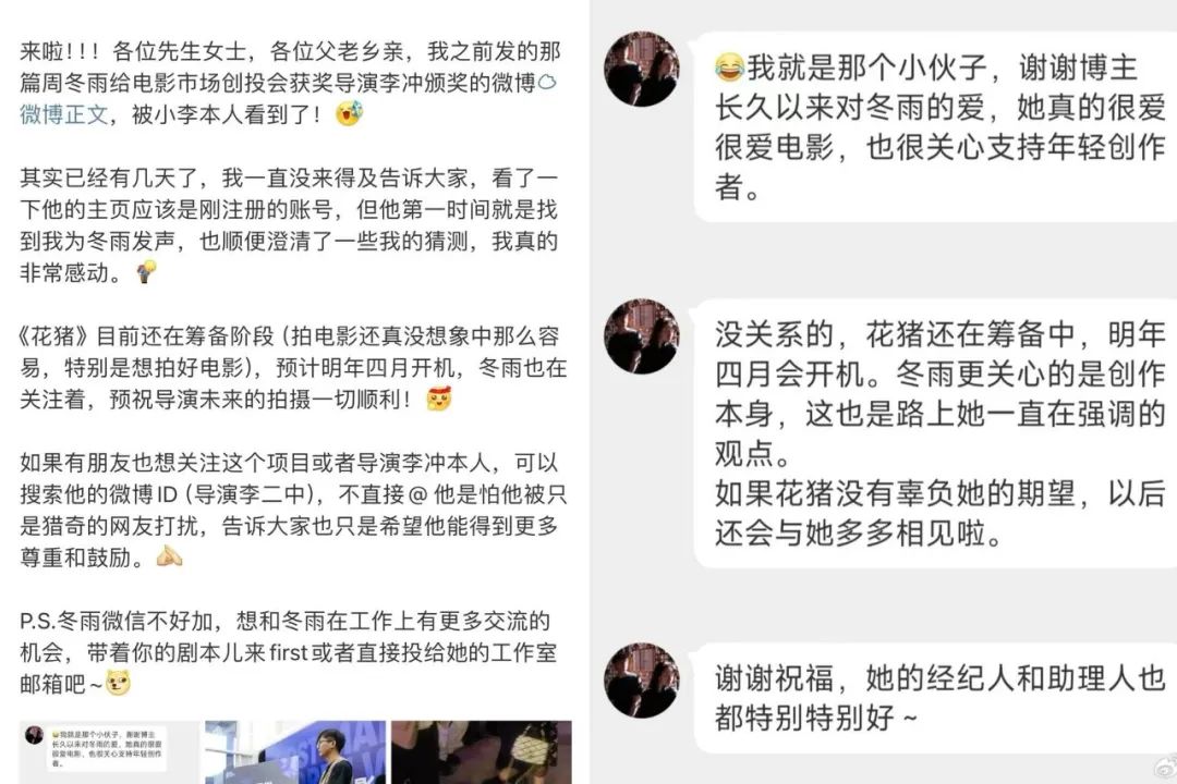 周冬雨曾在采访中透露,自2022年4月《鹦鹉杀》杀青后,她没进过剧组,给自己放了个长假,唯一要启动的项目是即将开机的《花猪》。这个剧本是她在担任 FIRST 创投评委时发现的,由于非常喜爱这个故事,她很想帮助新人导演完成,“坦白讲,我也不认为它是一个能拿票房的片子,甚至上不上映我都没考虑过,就是挺想帮他把这个故事拍出来。”《花猪》的导演李冲也在微博上回应网友:“冬雨更关心的是创作本身。”