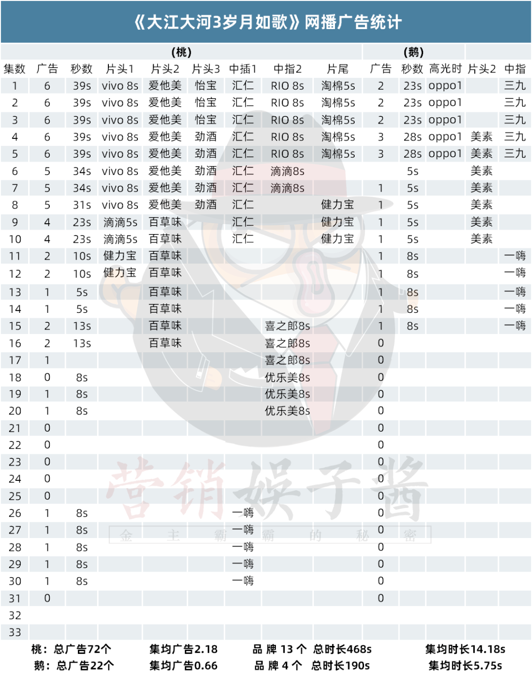 由中央电视台、正午阳光、爱奇艺出品的《大江大河3》,上星央视开播收视高达1.5%,猫眼监测鹅、桃热度值仅次于《繁花》,播出一周后广告数量却骤然减少。截至目前,在爱奇艺只剩一个中插广告,在腾讯视频已经没有广告。