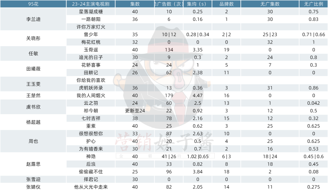 同为95花的杨超越,主演的《重紫》集均广告数量仅0.62个,被押宝爆剧的《七时吉祥》也从满广走到了“吃萝卜”。甚至号称“95花带货王者”的赵露思,也没能实现全集有广的成绩。23年唯95花唯二全广剧集,是由新丽出品、田曦薇、曾舜曦主演的《田耕记》,以及周也、檀健次主演的《很想很想你》。