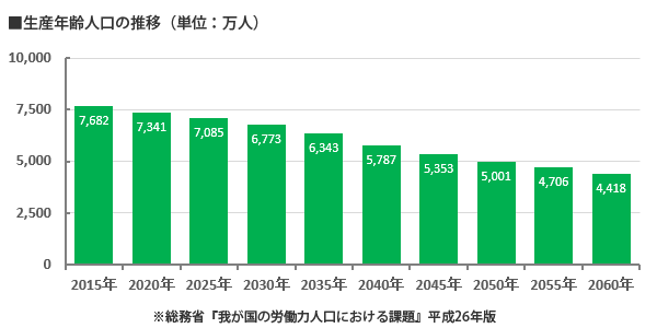 如果我们针对劳动年龄人口(15岁以上65岁以下的族群)来看,日本目前有7600万人,但在2060年只会剩下4400万人,也就是42.5%的劳动年龄人口会在接下来的43年消失。