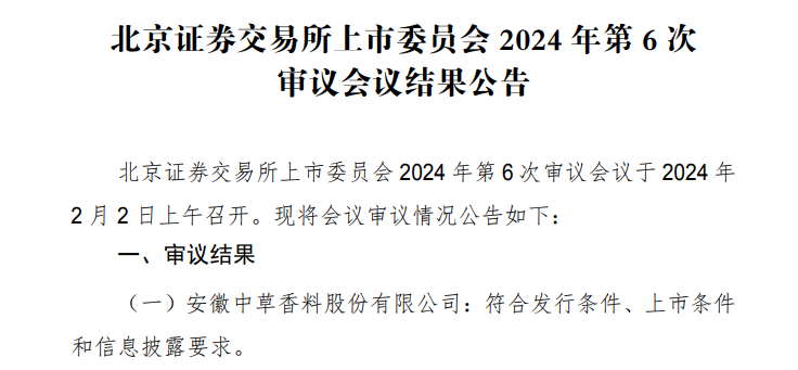 2月2日,青眼从北交所官网获悉,北交所上市委2024年第6次审议会议同意安徽中草香料股份有限公司(以下简称“中草香料”)公开发行股票的注册申请。这也意味着,中草香料或将成为2024年首个香料香精上市企业。