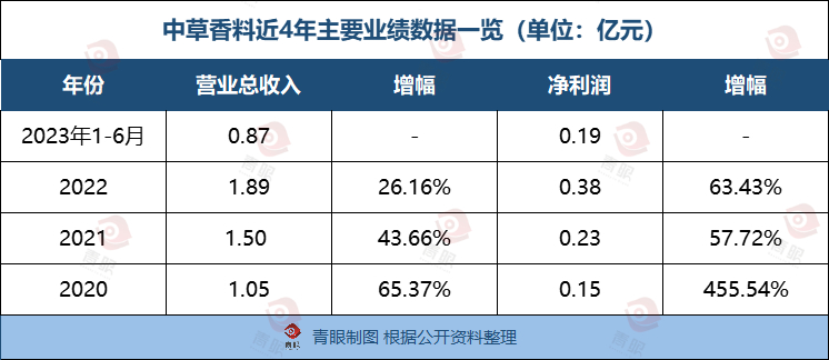 青眼梳理了中草香料近年来的主要财务数据,2020年至2023年上半年,中草香料营收分别为1.05亿元、1.50亿元、1.89亿元、0.87亿元;净利润分别为1463.05万元、2307.51万元、3771.25万元、1887.67万元;归母扣非净利润分别为1242万元、2402万元、3378万元、1564万元;毛利率分别为27.42%、32.35%、33.88%、34.16%。