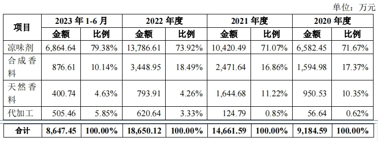 不过,上述两类产品占中草香料总营收比重并不高。从2023年上半年数据来看,中草香料79.38%的营收均来自于凉味剂产品,且从2021年开始该比例就在逐年上升;合成香料产品为第二大类产品,占总营收的10.14%,呈逐年下滑态势;而天然香料产品则仅占4.63%,但相比于2020年度的0.62%,有明显提高。