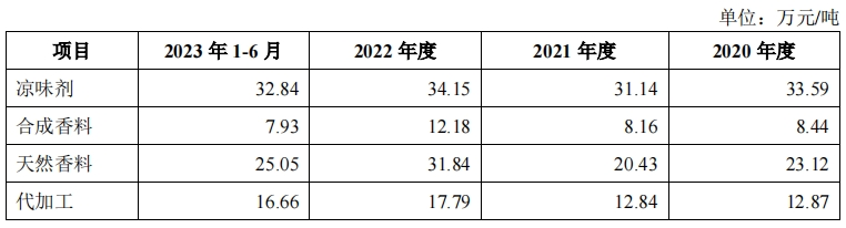 如合成香料价格在2022年就从8万元/吨的价格直升为12万元/吨,2023年上半年又降为7.93万元/吨,天然香料价格波动也较大;不过,凉味剂产品近年来价格较为稳定,售价维持在31.14-33.59万元/吨。