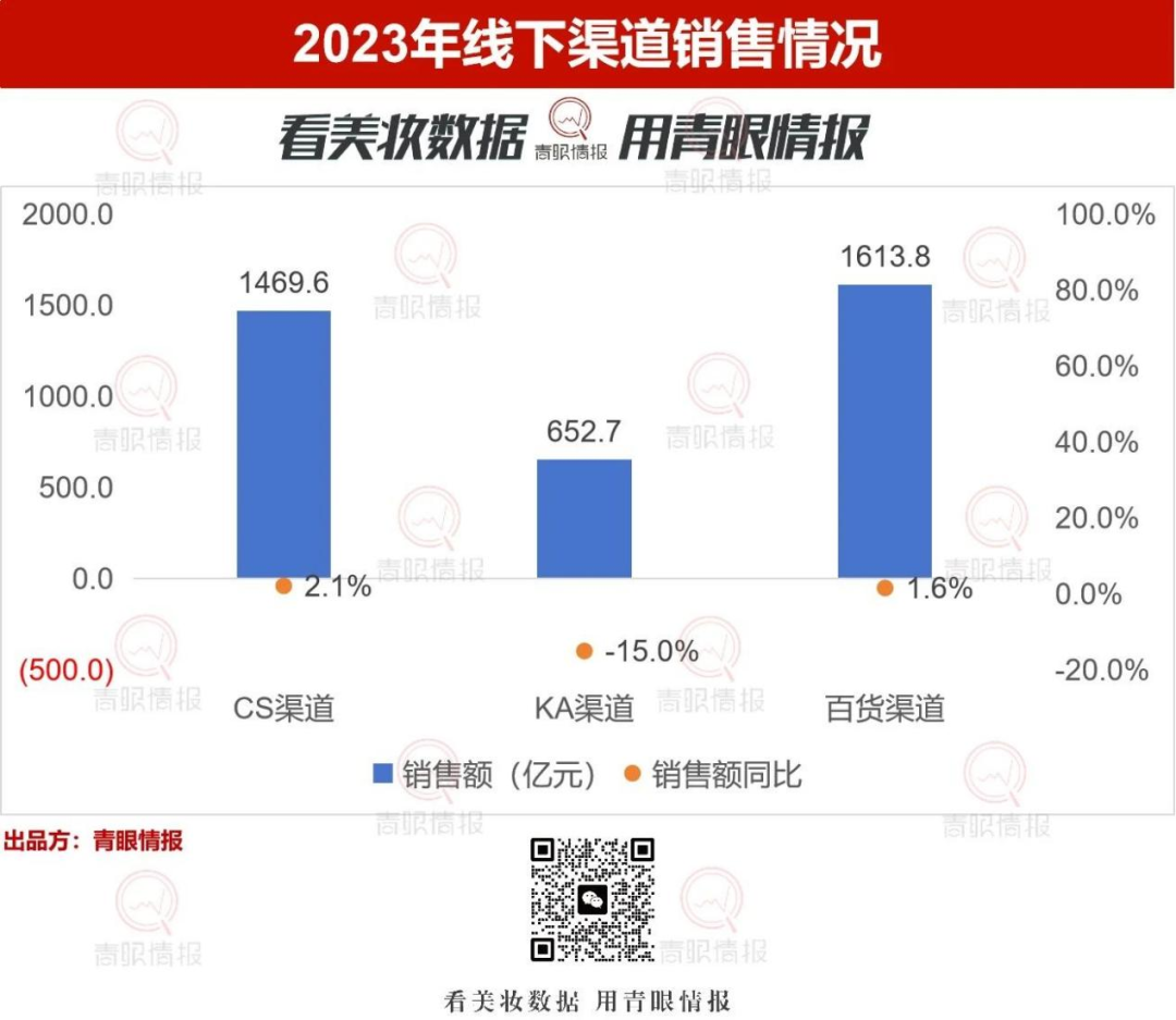 据青眼情报数据显示,2023年中国化妆品行业线下渠道销售额为3926亿元,同比微增0.8%。分渠道来看,百货渠道最高,销售额达到了1613.8亿元,同比增长1.6%,其次为CS渠道与KA渠道。