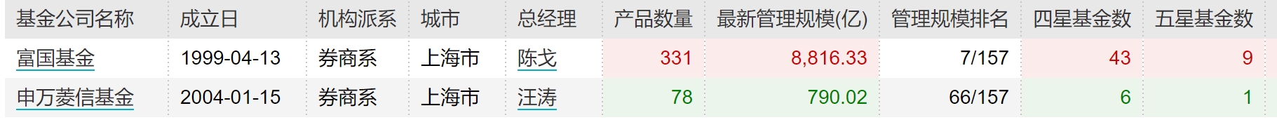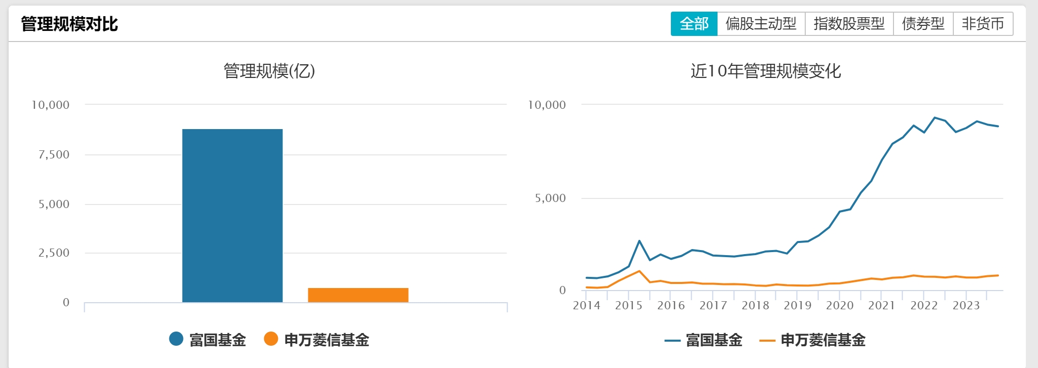 Wind披露,成立于2004年的申万菱信基金截至2023年四季度末基金资产净值仅790.02亿元,规模不足富国基金(1999年成立)的十分之一。截至四季度末,富国基金基金资产净值高达8816.33亿元,稳居业内第7。