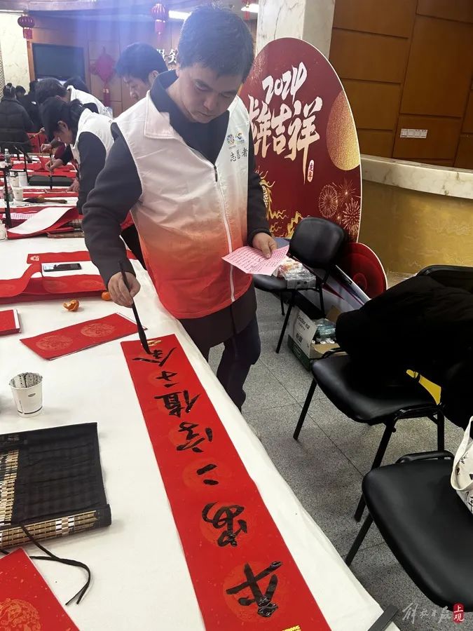 池颖华来自青浦,坐了两个多小时车来到上海文艺会堂,参加“万福迎春·文艺志愿服务活动启动仪式”,随后立马开赴上海火车站。穿着志愿者马甲,有人问他身份,他一律以“我是志愿者”作答。“今年已经参加多场为市民送福字和春联的活动,来火车站是第一次,写得特别开心!”池颖华说,春联映着旅客们的笑脸,“大家欢喜,我们也高兴。”