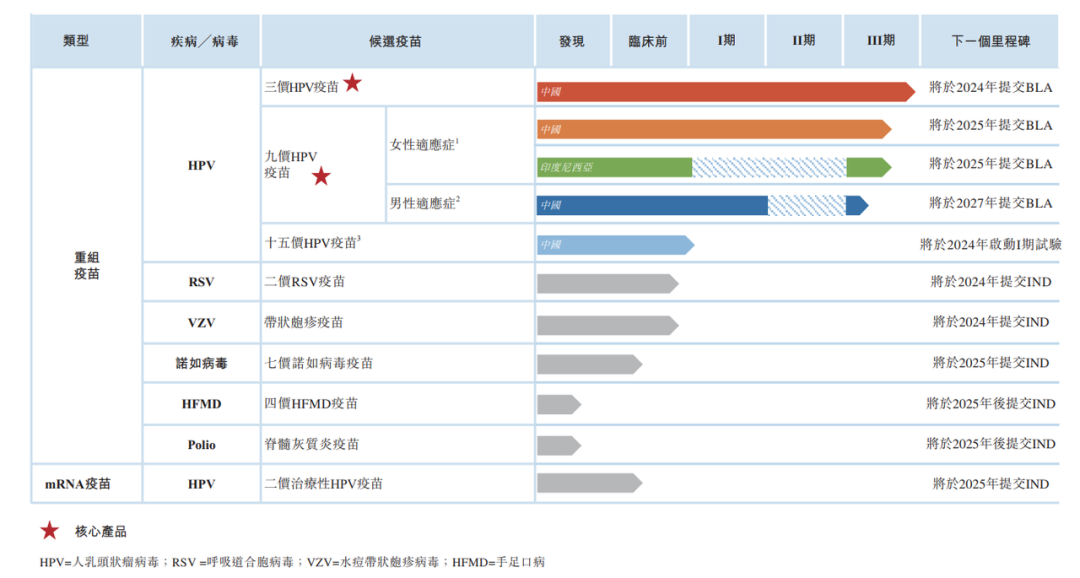 其中,与HPV相关的疫苗有5个,而三价、九价HPV疫苗为公司核心产品。
