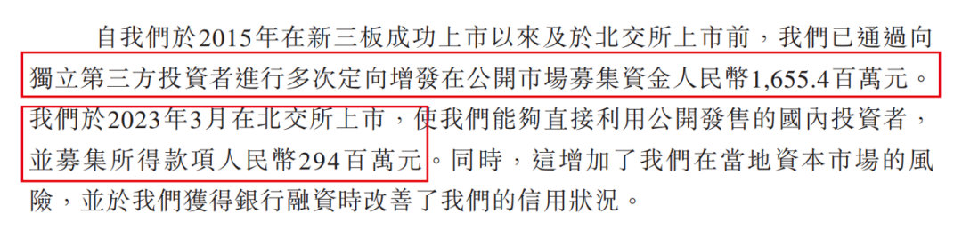 招股书显示,自公司于2015年在新三板上市以来及于北交所上市前,公司已通过向独立第三方投资者进行多次定向增发在公开市场募集资金16.55亿元。