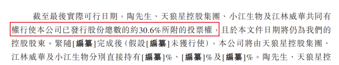 截至2024年1月22日,陶涛、天狼星控股集团、小江生物及江林威华共同有权行使公司约30.6%股权所附的投票权,为控股股东。公司2023年中期财报明确,陶涛为公司实际控制人。