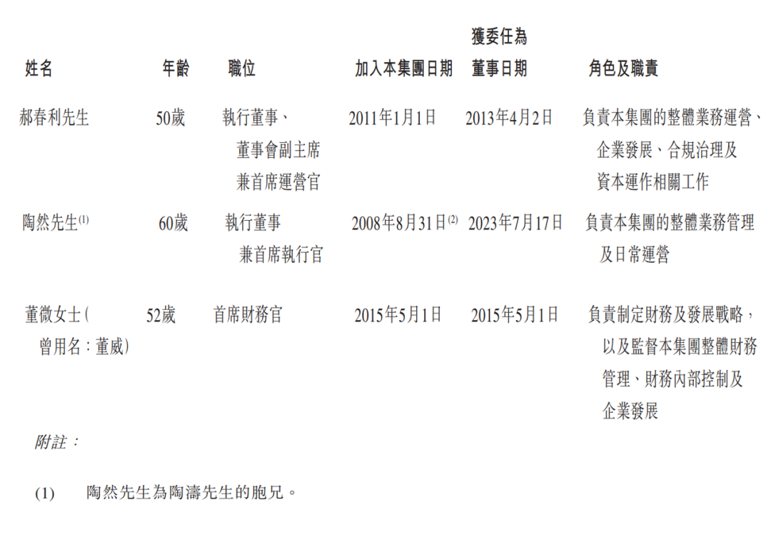 其中,跟随陶涛多年的郝春利任职执行董事、董事会副主席兼首席运营官,董微任职首席财务官;陶涛胞兄陶然任职执行董事兼首席执行官。