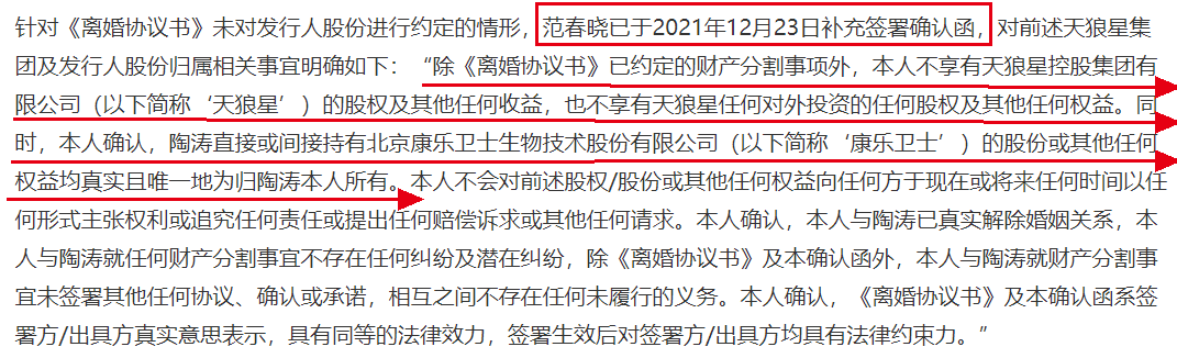 直到2021年12月23日,范春晓才补充签署确认函,明确“除《离婚协议书》已约定的财产分割事项外,本人不享有天狼星控股集团的股权及其他任何收益。同时确认,陶涛直接或间接持有康乐卫士的股份或其他任何权益均真实且唯一地为归陶涛本人所有。”