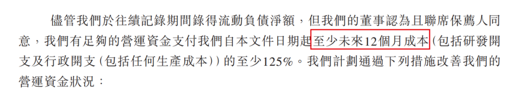 按照康乐卫士的说法,公司的资金能够支付自本文件日期起至少未来12个月至少125%的成本,包括研发开支及行政开支(包括任何生产成本)。