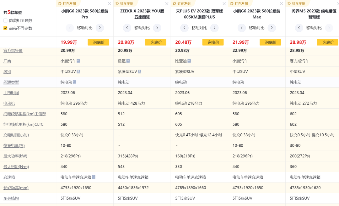 汽车配置角度,小鹏G6(580续航pro)的价格跟极氪X、比亚迪宋EV一个级别。但800V SiC动力平台、快充还带高阶智驾(XNGP)的配置,显然是料更足。