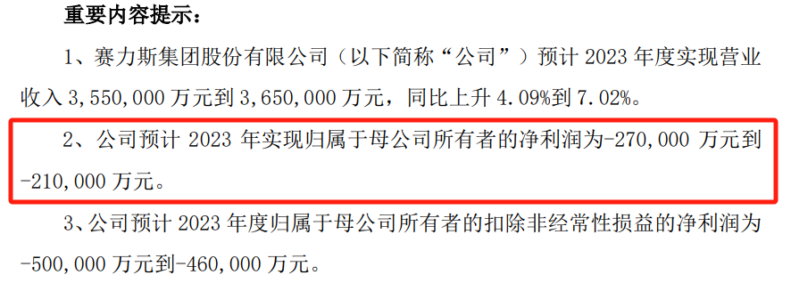 上为赛力斯2023Q4业绩预告,下为2023Q3财报 来源:公司公告