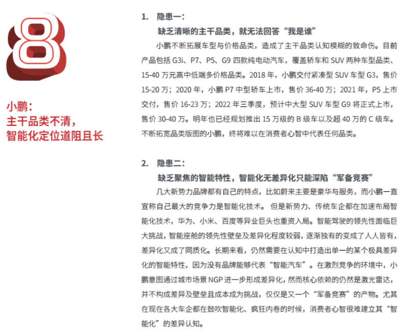 如G3定位兼具低端和B端属性;P7对标特斯拉Model 3,卡位同级价格段的产品缺失;P5试图在2021年“提前”取得市场对智能化的定价;G9智能车“大满配”,但配置过于细分。
