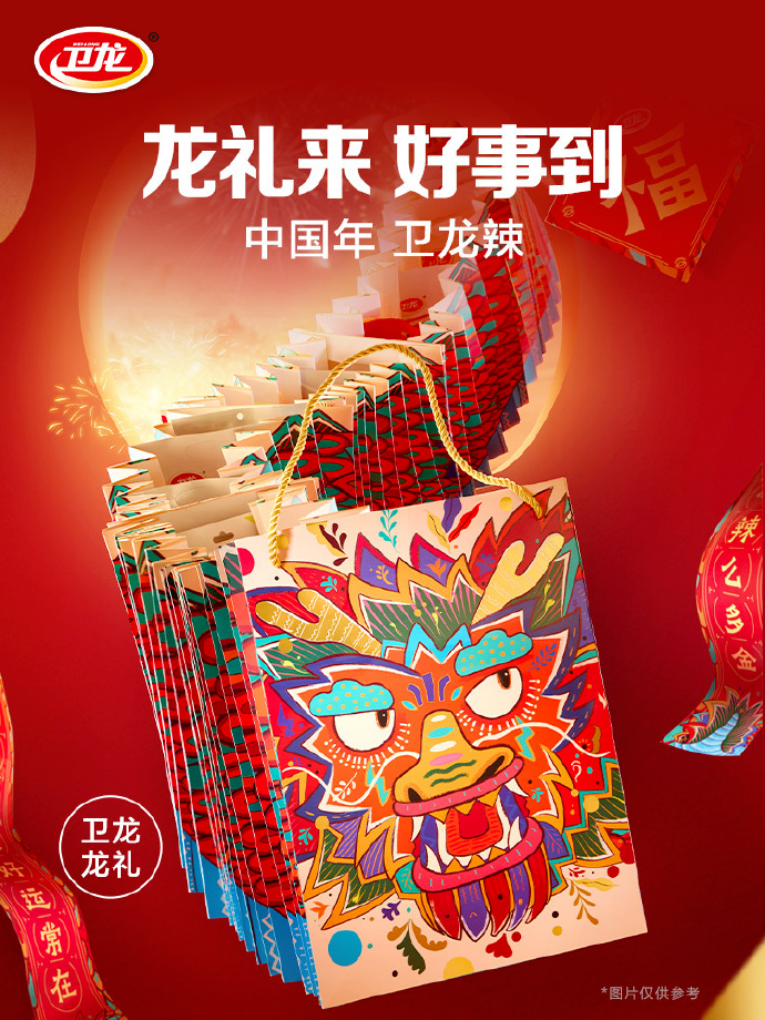为了与年轻人构建情感连接,卫龙围绕“中国年 卫龙辣”主题重新定义好吃玩好过大年,除了推出了一系列令人捧腹的《卫龙笑富了贺岁片》展示年味,卫龙还推出独特的“卫龙龙礼”新年礼盒。据介绍,本次礼盒由中国著名包装设计师潘虎亲自执笔设计,其创意灵感源自中国传统文化的舞龙,手风琴的褶皱可拉伸式的礼盒设计,着实为产品增添了不少开盒趣味。