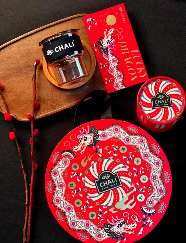 CHALI推出“龙年转大运”新年茶包礼盒,其灵感来源于中国民间传统剪纸与古老艺术“皮影戏”,呈现富有戏剧性又不失雅韵的 “舞龙祈福”之景。礼盒共包含6种口味的茶包:蜜桃乌龙、甜橙红茶、刺梨山楂绿茶、红豆薏米茶、红柚普洱茶、竹蔗茅根马蹄茶。礼盒中间还有一个祥龙竹节杯,取竹意,表达节节高升、前程似锦的美好祝愿。