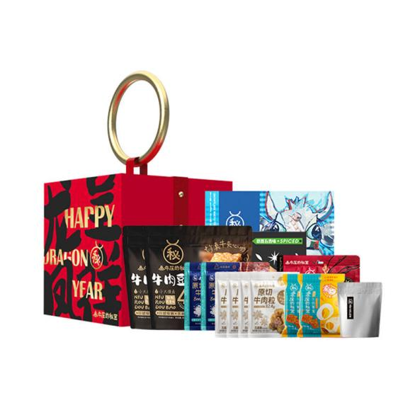 金牛座的秘密推出新年「龙凤呈祥」限定礼盒,礼盒内精选多款牛肉零食:原切牛肉片、原切牛肉粒、吮指牛肉、牛小筋、雪花和牛、牛肉脆脆、魔幻牛肚、牛肉豆堡,本款礼盒采用红色为底色,搭配金色、黑色字体,内附新年灯笼,节日氛围感浓厚,健康美味,送礼首选!