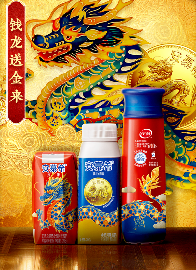 如果说可口可乐是“生肖罐”,农夫山泉则是“生肖瓶”,而且“生肖瓶”已经成为农夫山泉新年借势营销的一个持续性的保留项目。同样喜欢在印刷上做文章的,还有安慕希的限定款钱龙包装酸奶,瓶身相接可以组成一条钱龙。这些“龙年限定”集许愿、祈福、守望于一身,让包装为概念说话,引起消费者共鸣。