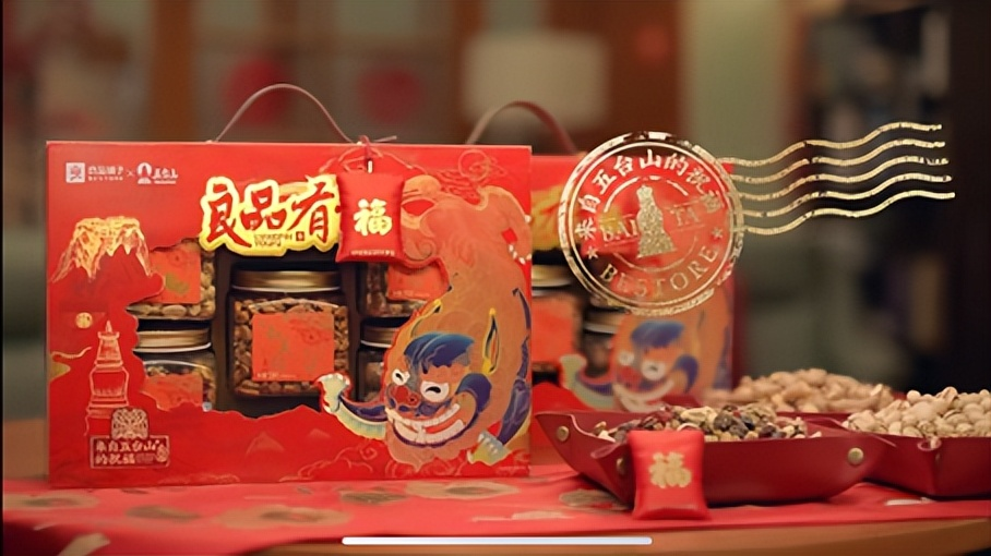 良品铺子与五台山IP联名的年货礼盒为送“福”而生,外观印有青狮、莲花、大白塔等代表福气祥瑞的五台山标志,搭配买礼盒抽福卡活动,开门纳福、出门送福、职场派福、福气满满等来自五台山的“福气连连”福包,一举击中Z世代喜好。