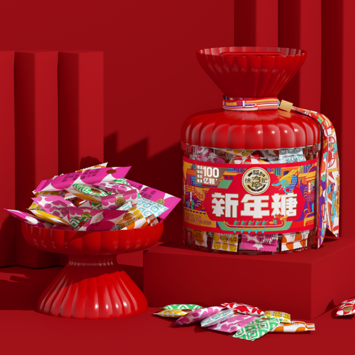 再看看徐福记,这个纵横糖果界31年的品牌,为迎合当代年轻人的情绪消费,推出新潮的新年糖果礼盒。其罐身是传统制糖工序插画,传递出深厚内涵的中华糖文化;罐盖配以精美丝巾,缔造新春之仪,透露出点缀生活的仪式感;整体造型也蕴含“小心机”,罐盖倒转可以变成果盘,糖罐造型单个为福袋,成双是超大糖果。