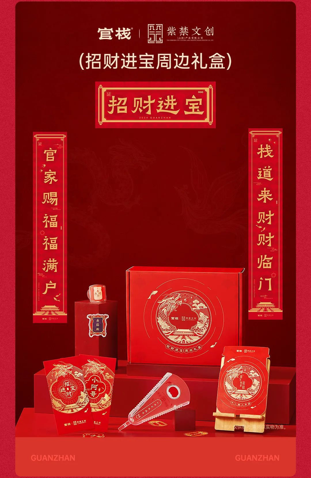 官栈携手紫禁文创推出胶原花胶新春礼盒和招财进宝周边礼盒,包含官栈即食花胶产品、十二美人月历、奉旨发财手机支架、招财进宝红包、新春对联和宫廷人物趣味贴纸、奉旨开运多功能开瓶器等产品。