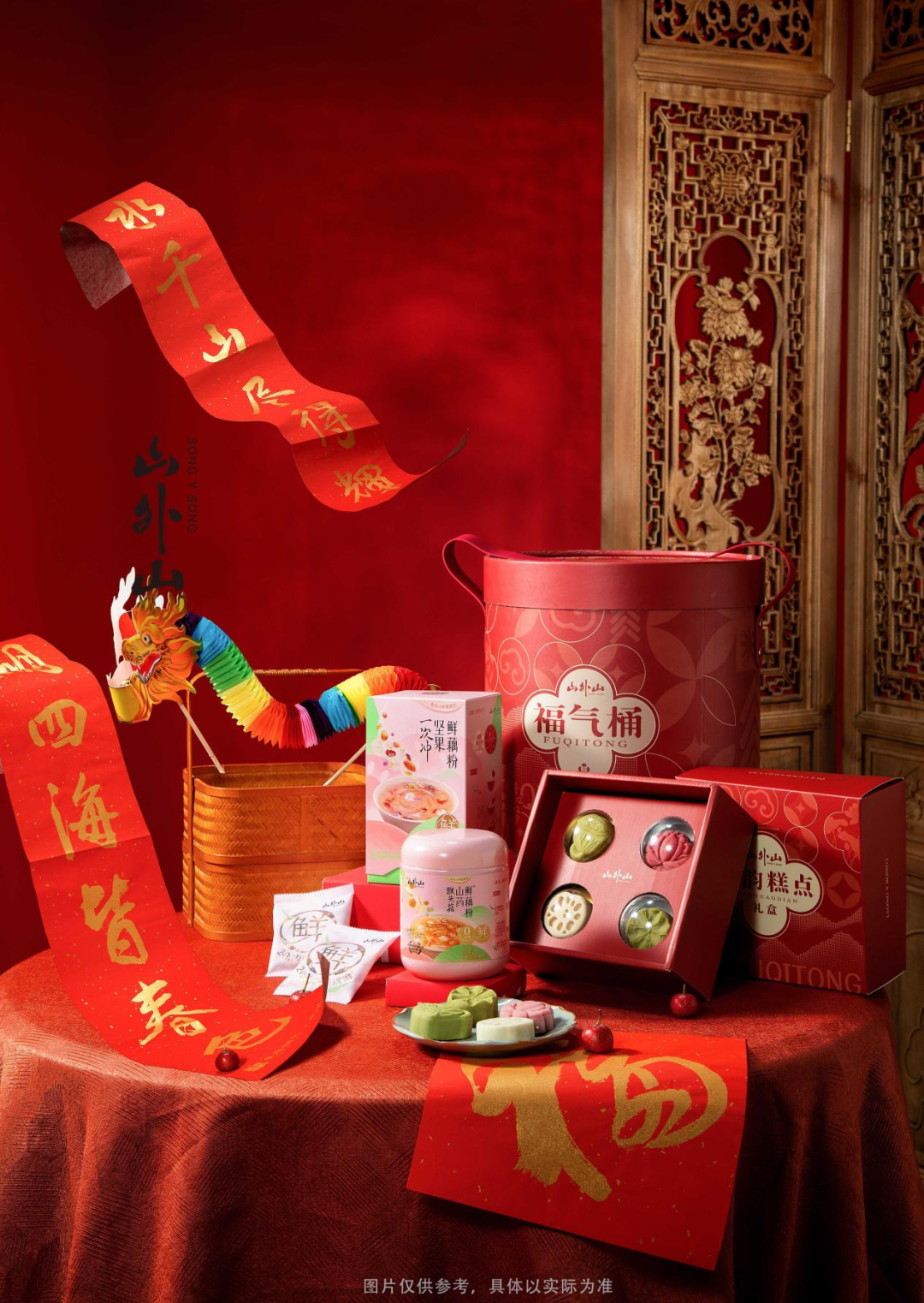 致力于宋韵文化新消费品牌山外山推出福气桶,其灵感来源于不同寓意的吉祥底纹组合,分别为如意纹·荷花纹·铜钱纹·山海纹,寓意提一桶福气。内含:山外山 次冲坚果鲜藕粉、猴头菇山药鲜藕粉、山海菏韵新春糕点,借鉴荷花造型,酥层清晰, 软 甜。除此以外,还有朱府铜艺非遗大师朱炳仁亲笔墨宝拓印新春对联(限量版)、国潮五彩纸龙以及龙年福字,寓意集福于桶,福气过年。