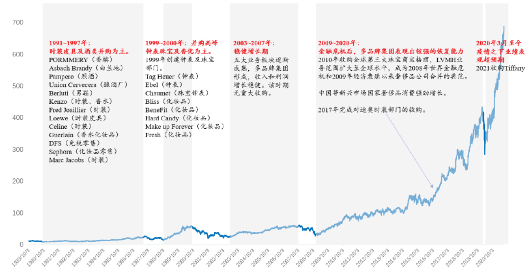 从历年来LVMH股价的波动趋势中可以看出,上市以来LVMH市值一直在稳步上升,尤其在2010年收购宝格丽、2017年收购迪奥时装部门以及2021年收购蒂芙尼三个节点股价都有明显的上升趋势。