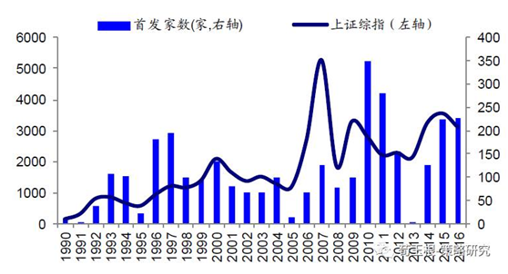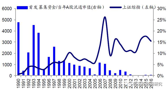 在IPO发行家数和融资金额趋降时行情多处下跌阶段,如1993-1995年熊市期间每年IPO发行家数从107家减少至21家,融资金额从130亿元减少至21亿元,2011-2012年熊市期间每年IPO发行家数从281家减少至155家,融资金额从2810亿元减少至1034亿元。在IPO发行家数和融资金额较为平稳时行情多处于震荡阶段,如2002-2003年震荡市期间每年IPO发行家数从68家微降至67家,融资金额从480亿元微降至472亿元。总体上,IPO供给基本上保持动态平衡,IPO发行节奏与A股行情更是相生相长的关系,在牛市中IPO发行较多,在熊市中IPO发行更少,在震荡市中IPO发行节奏保持平稳。