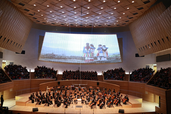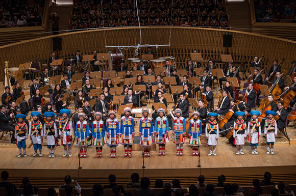 “我们从远古走来/我们是三江的儿女/我们跟着月亮我们追随着太阳……”1月17日晚,天籁之音环绕在上海交响乐厅的上空。舞台上,傈僳族的孩子们微笑着,这是属于他们的美好时刻。这一晚,他们无疑是舞台上的主角。而在整场音乐会上投入演奏的大师们,来自上海小荧星艺术团和傈僳族孩子们一起合唱《我的祖国》的80名小朋友,甘为绿叶。